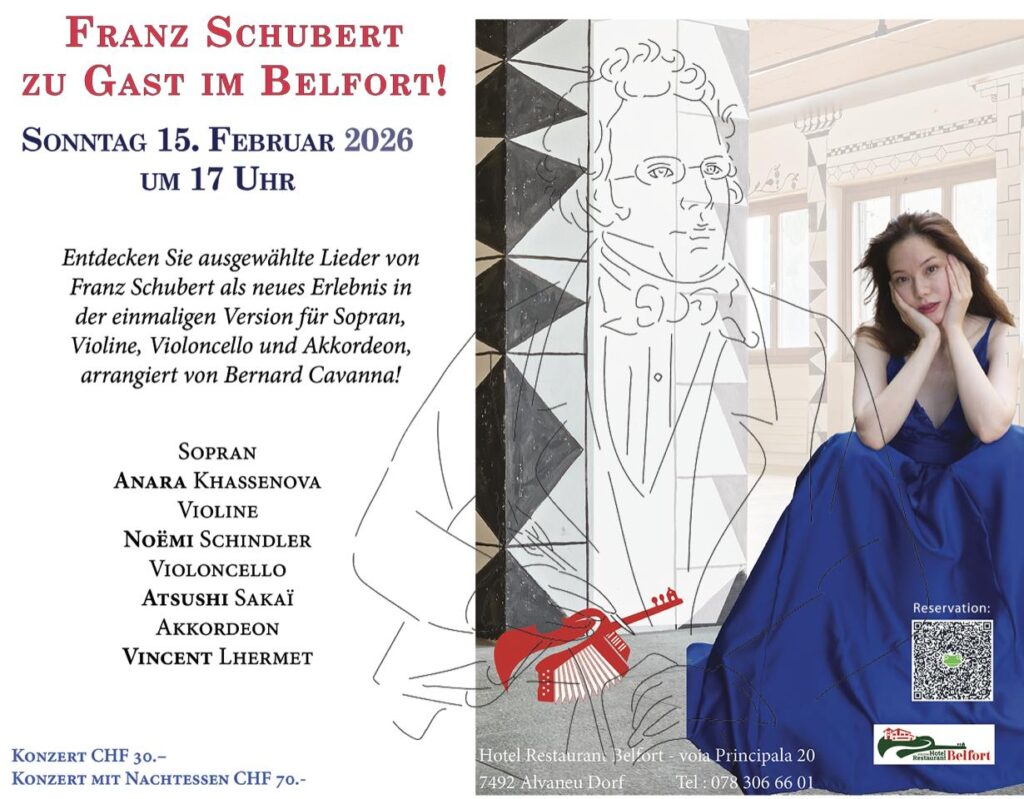 Erleben Sie Franz Schubert in einer aussergewöhnlichen musikalischen Begegnung im Kulturhotel-Restaurant Belfort. Ausgewählte Lieder des Wiener Komponisten erklingen in einer einzigartigen Bearbeitung für Sopran, Violine, Violoncello und Akkordeon – arrangiert von Bernard Cavanna.